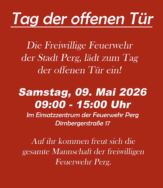 Sam09Mai9:0015:00Tag der offenen Tür bei der Feuerwehr der Stadt Perg9:00 - 15:00 VeranstalterFreiwillige Feuerwehr PergFeuerwehrhaus Perg, Dirnbergerstraße 17, 4320 Perg