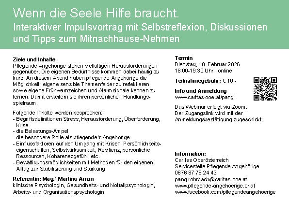 Anmeldung unter www.caritas-ooe.at/pang. Der Zoom-Link wird mit der Anmeldebestätigung zugeschickt.
